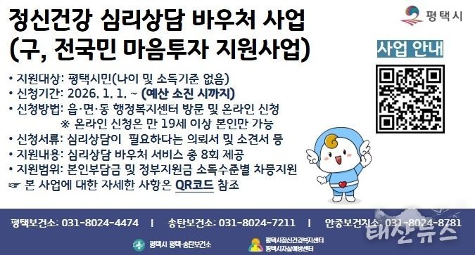 태산뉴스 이지율 기자 | 평택시에서는 시민의 마음 건강을 지키고 자살 예방 및 정신질환 조기 발견을 돕기 위한 ‘정신건강 심리상담 바우처사업’을 2026년에도 계속 추진한다.