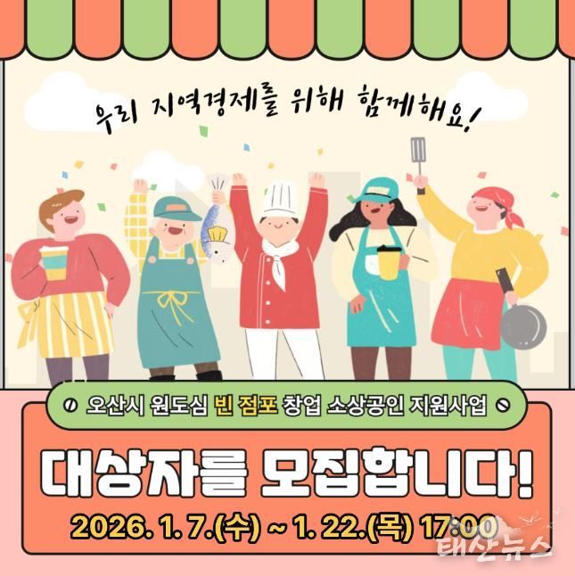 태산뉴스 이동욱 기자 | 오산시는 오산역 앞 아름다로(구 문화의 거리) 일대 원도심 빈 점포를 활용한 창업 소상공인을 대상으로 임차료를 지원하는 ‘원도심 빈 점포 창업 지원’ 사업의 대상자를 이달 22일까지 모집한다고 밝혔다.