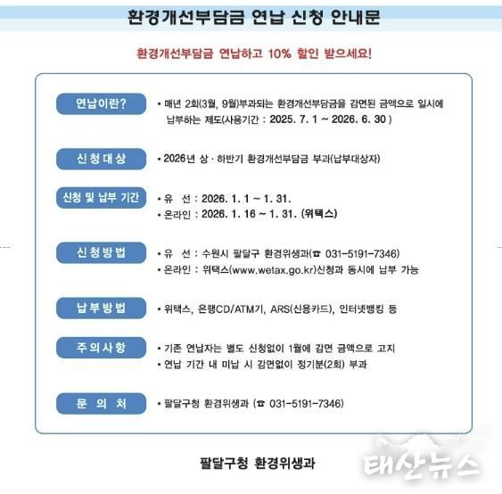 태산뉴스 이동욱 기자 | 수원시 팔달구는 환경개선부담금 납부 대상자를 대상으로 1월 31일까지 환경개선부담금 연납 신청을 받는다.