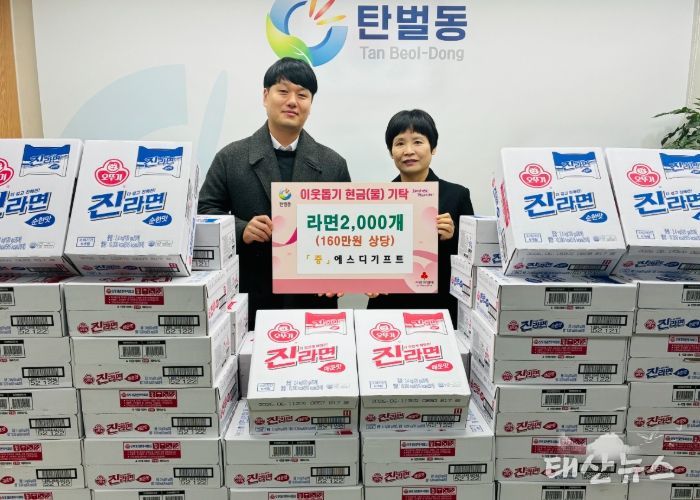 이번 나눔은 최근 고물가로 식료품비 부담이 크게 늘어난 상황에서 저소득 가구의 생계 부담을 덜어주기 위해 에스디기프트가 자발적으로 마련했으며 기탁된 라면은 탄벌동 행정복지센터를 통해 지역 내 기초생활수급자와 차상위계층 등 저소득 가구에 전달될 예정이다.