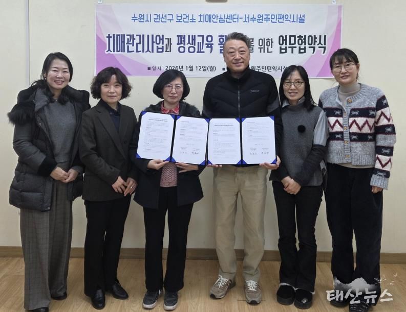 태산뉴스 이동욱 기자 | 수원시 권선구보건소 치매안심센터와 서수원주민편익시설은 12일 서수원주민편익시설 강의실에서 치매관리사업과 평생교육 활성화를 위한 업무협약을 체결했다.