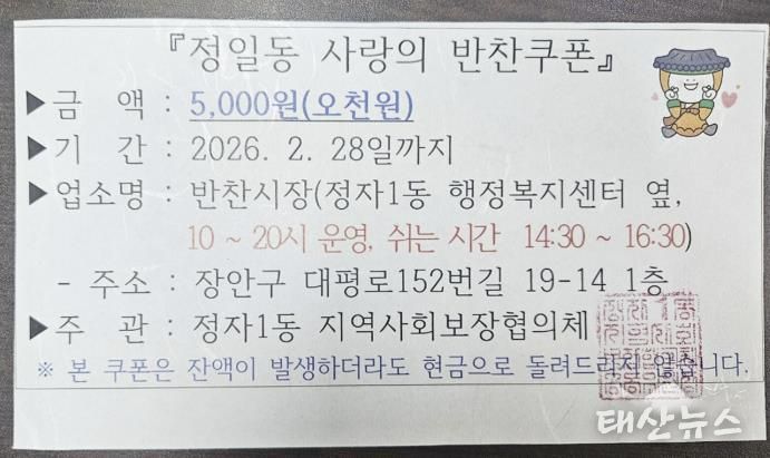 태산뉴스 이동욱 기자 | 수원시 장안구 정자1동 지역사회보장협의체는 금년부터 관내 취약계층 가구를 대상으로 매월 5가구에 2만원 상당의 반찬쿠폰을 지급하는 사업을 시작한다고 지난 13일 밝혔다.