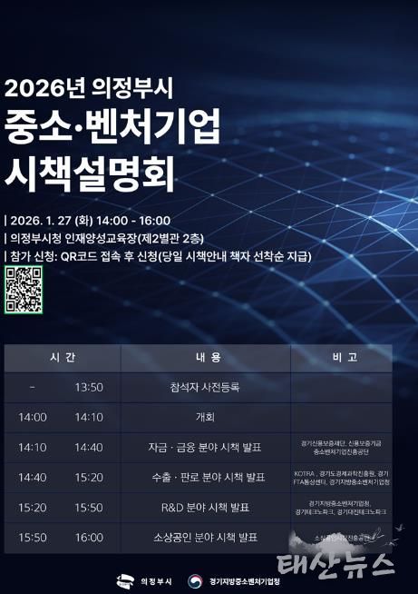 태산뉴스 이동욱 기자 | 의정부시는 ‘2026년 중소‧벤처기업 시책설명회’에 참가할 지역 중소‧벤처기업인을 1월 26일까지 모집한다.