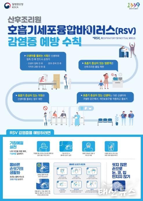 RSV는 전염력이 높아 산후조리원, 어린이집, 의료기관 등 영유아가 밀집한 시설에서 집단 발생으로 이어질 가능성이 크다. 이에 따라 콧물, 기침, 가래 등 호흡기 증상이 있는 경우에는 등원이나 외출을 자제하고 충분한 휴식을 취해야 하며, 손씻기와 기침 예절 준수, 마스크 착용, 실내 환기 등 기본적인 감염 예방수칙을 철저히 지켜야 한다.