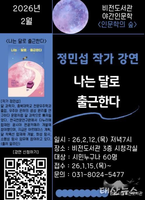태산뉴스 이지율 기자 | 평택시 비전도서관은 오는 2월 12일 저녁 7시 달 과학자 정민섭 작가를 초청하여 ‘나는 달로 출근한다’를 주제로 야간 인문학 강연을 진행한다.