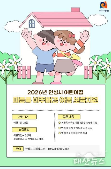 태산뉴스 이동욱 기자 | 안성시는 2026년부터 어린이집에 다니는 미등록 외국인(이주배경) 영유아에게 월 10만원의 보육지원금을 지원한다고 밝혔다.