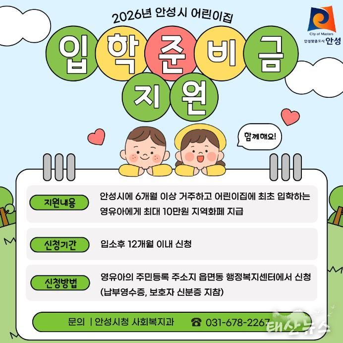 태산뉴스 이동욱 기자 | 안성시는 2026년부터 어린이집 입학준비금 지원사업을 시행한다고 밝혔다.