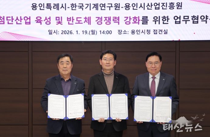 태산뉴스 이지율 기자 | 용인특례시는 19일 시청 접견실에서 한국기계연구원(KIMM), 용인시산업진흥원과 ‘첨단산업 육성 및 반도체 경쟁력 강화를 위한 업무협약’을 체결했다.