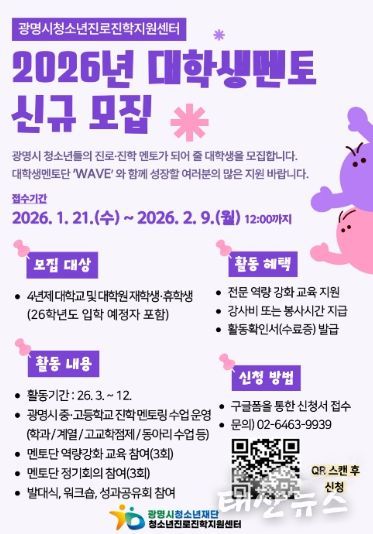 태산뉴스 이동욱 기자 | 광명시청소년재단 청소년진로진학지원센터는 관내 중·고등학교 청소년 대상 학과 멘토링 운영을 위해 ‘2026년 대학생 멘토단(wave)’을 모집한다고 밝혔다.