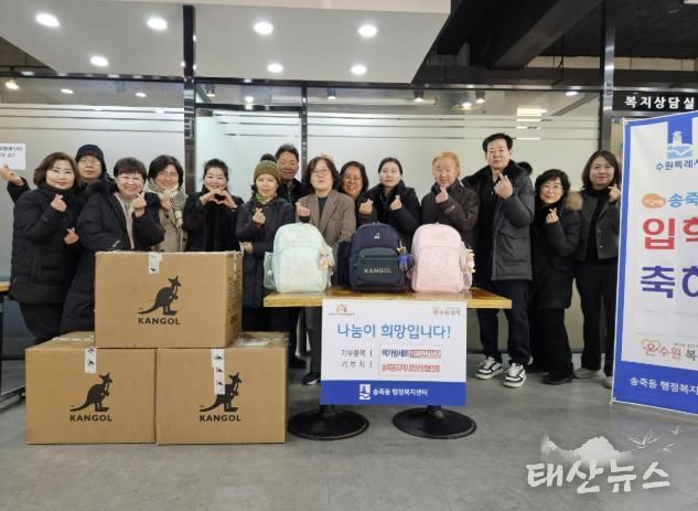 태산뉴스 이동욱 기자 | 수원시 장안구 송죽동 지역사회보장협의체가 지난 21일 송죽동 행정복지센터에서 2026년 초등학교 입학을 앞둔 저소득 가정 아동 9명을 대상으로 ‘입학아동 책가방 지원 사업’을 추진했다.