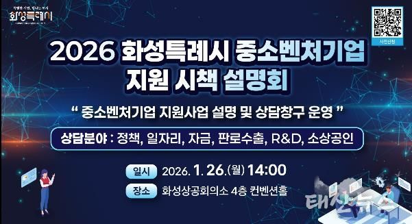 태산뉴스 이동욱 기자 | 화성특례시가 관내 중소기업과 소상공인의 경영 애로 해소와 지원사업 활용도를 높이기 위해 오는 26일 화성상공회의소 컨벤션홀에서 ‘2026년 화성특례시 중소벤처기업 지원 시책 설명회’를 개최한다.