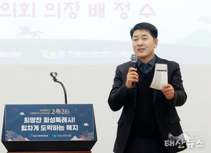 태산뉴스 이지율 기자 | 화성특례시의회는 26일 호텔 푸르미르 그랜드볼룸에서 열린 '2026년 화성시사회복지협의회·사회복지사협회 신년인사회'에 참석해, 병오년 새해를 맞아 사회복지 종사자들과 함께 희망과 연대의 뜻을 나눴다.