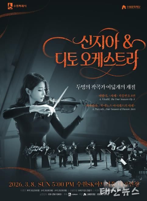 수원문화재단은 비발디와 피아졸라의 명작 ‘사계’를 한 무대에서 만나는 '신지아&디토오케스트라'를 오는 3월 8일 일요일 오후 5시 수원SK아트리움에서 개최한다.