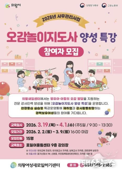 태산뉴스 이동욱 기자 | 의왕시 여성새로일하기센터가 '오감놀이지도사 양성 특강'의 교육생을 모집한다.