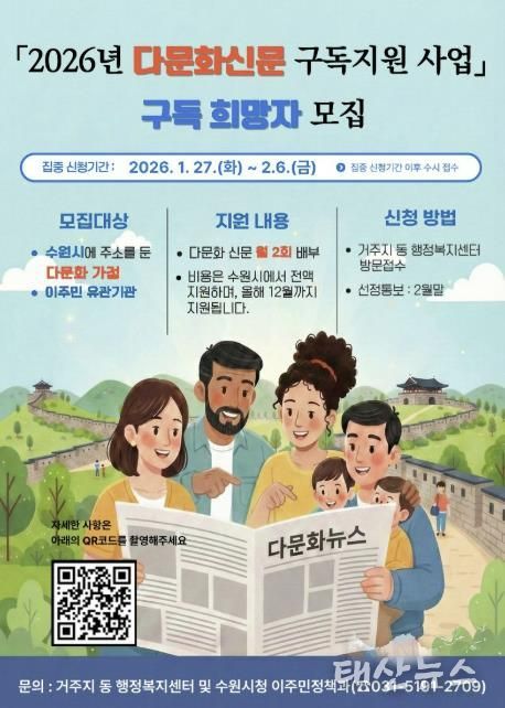 태산뉴스 이동욱 기자 | 수원특례시가 다문화가족의 한국 생활 적응을 돕기 위해 ‘다문화신문 구독 지원 사업’ 대상자를 모집한다.
