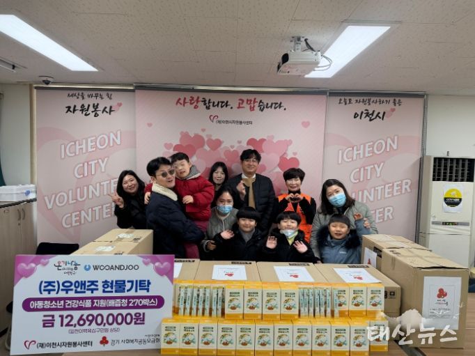 태산뉴스 이동욱 기자 | 이천시자원봉사센터는 1월 30일 센터 다목적실에서 ㈜우앤주(대표 송우)의 지원으로 현물 기탁식을 진행했다.