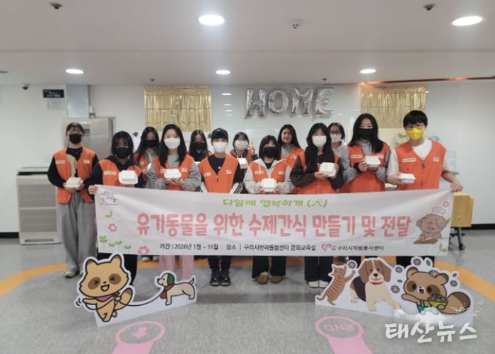 태산뉴스 이동욱 기자 | 구리시는 사단법인 구리시자원봉사센터가 구리시 반려돌봄센터와 공동으로 지난 1월 31일, 청소년 15명이 참여한 가운데 유기 동물을 위한 수제 간식 만들기 및 배식 봉사활동을 진행했다고 밝혔다.