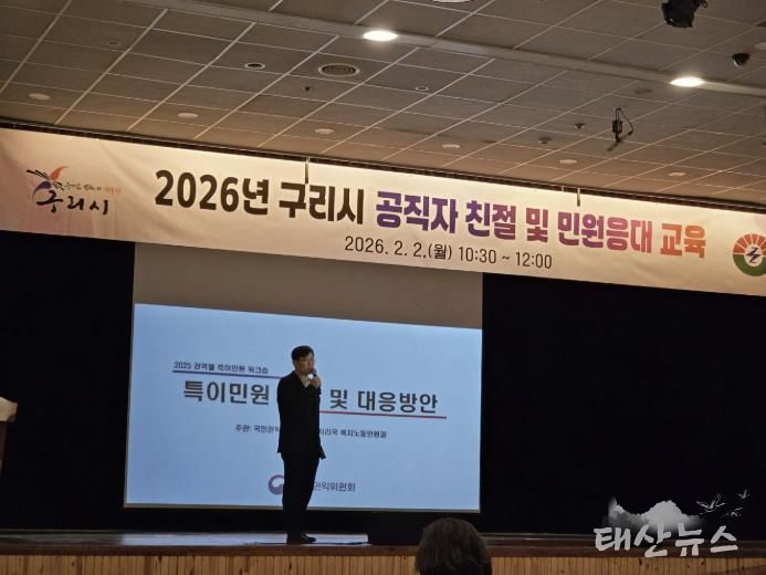 태산뉴스 이동욱 기자 | 구리시는 지난 2일 시청 1층 대강당에서 시민이 체감하는 고품격 민원 서비스를 구현하기 위해 전 직원을 대상으로 ‘2026년 구리시 공직자 친절 및 민원 응대 역량 강화 교육’을 실시했다.