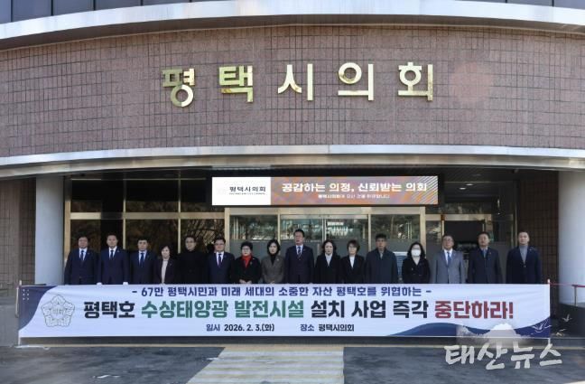 태산뉴스 이지율 기자 | 평택시의회는 2월 3일, 시의회 본관 앞에서‘평택호 수상태양광 발전시설 설치 중단 촉구 성명서’를 발표했다.