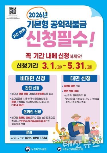 태산뉴스 이동욱 기자 | 양주시가 농업·농촌의 공익기능 증진과 농업인의 소득 안정을 위해 ‘2026년 기본형 공익직접지불금’을 오는 3월 1일부터 5월 31일까지 신청받는다.
