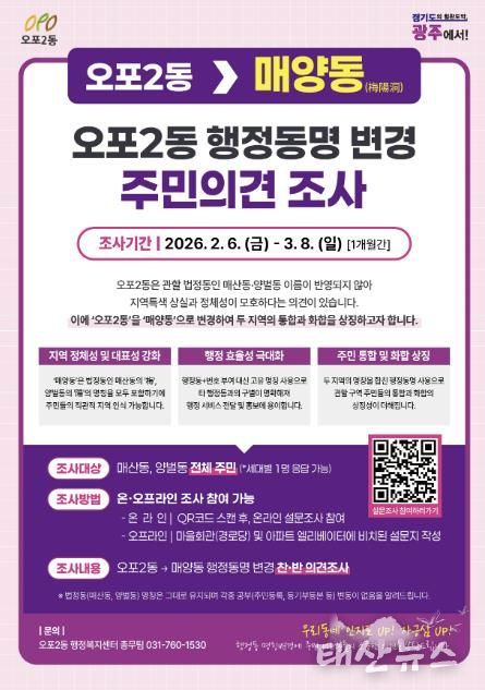 태산뉴스 이동욱 기자 | 광주시 오포2동은 지역 정체성을 반영한 행정동 명칭 변경을 위해 2월 6일부터 3월 8일까지 오포2동 전 세대를 대상으로 주민 의견 조사를 실시한다고 4일 밝혔다.