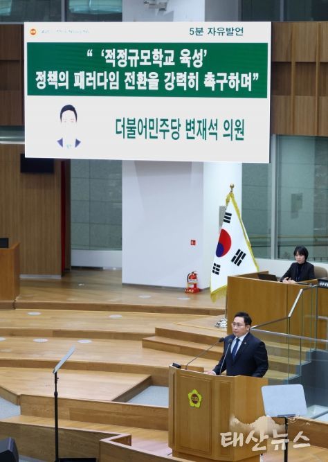 태산뉴스 김준수 기자 | 경기도의회 교육행정위원회 소속 변재석 의원(더불어민주당, 고양1)은 4일 열린 경기도의회 본회의 5분 자유발언을 통해 경기도교육청의 ‘적정규모학교 육성’ 정책이 통폐합과 폐교 중심으로 작동하고 있다며, 정책의 패러다임을 ‘정리’가 아닌 ‘지원’ 중심으로 전환할 것을 강력히 촉구했다.