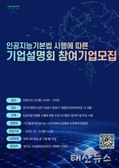 태산뉴스 김준수 기자 | 경기도가 지난 1월 22일 시행된 ‘인공지능 기본법’에 대한 도내 기업들의 이해를 돕기 위해 10일 오후 2시 판교 경기AI캠퍼스에서 AI 기업 대상 설명회를 개최한다.