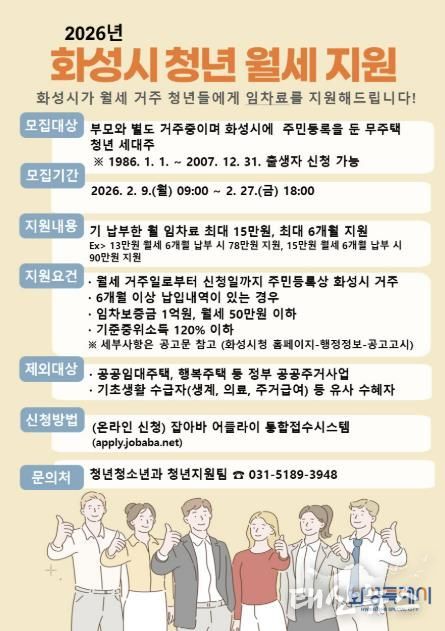 태산뉴스 이동욱 기자 | 화성특례시가 청년들의 주거비 부담을 덜고 안정적인 주거 생활을 지원하기 위해 2월 9일부터 2월 27일까지‘청년 월세 지원 사업’ 신청자를 모집한다고 밝혔다.