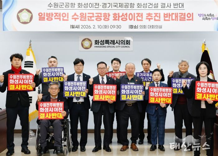태산뉴스 이지율 기자 | 화성특례시의회 수원 군공항 화성시 이전 반대 특별위원회는 10일 대회의실에서 수원시의 『수원군공항 이전 국가전략사업 추진』 및 『범정부 수원군공항 이전 TF 구성』 건의에 대한 반대 규탄 결의문을 발표했다.