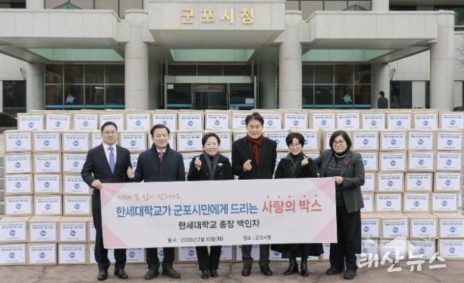 태산뉴스 이동욱 기자 | 유난히 추운 겨울이지만, 군포시에는 이웃을 향한 정성이 모여 훈훈한 설 명절 분위기가 피어나고 있다. 한세대학교는 10일, 지역 내 취약계층의 넉넉한 명절을 위해 ‘사랑의 희망박스’ 350세트를 군포시에 전달하며 상생의 가치를 실천했다.