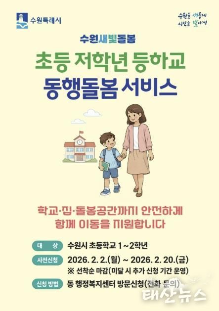 태산뉴스 이동욱 기자 | 수원특례시가 ‘초등 저학년 등하교 동행돌봄서비스’ 사전 신청 기간을 운영한다.