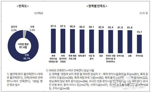 실제 외국인 축제 만족도는 평균 87.4점으로 나타났으며, 응답자의 98%는 ‘타인에게 추천할 의향이 있다’고 답했다. 2026년 재방문 의향 역시 80.7%로 조사돼, 일회성 방문이 아닌 반복 방문 가능성도 확인됐다.
