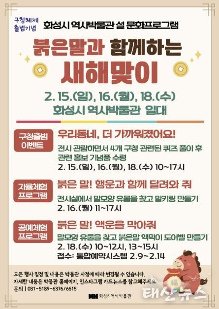 태산뉴스 이동욱 기자 | 화성특례시는 설 연휴 기간인 오는 2월 15일부터 18일까지 화성시 역사박물관에서 ‘붉은 말과 함께하는 새해맞이’ 설날 문화프로그램을 운영한다.