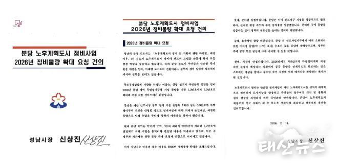 시는 11일 신상진 성남시장 명의로 국토교통부 장관에게 보낸 서한을 통해 “분당 신도시 주민들은 미래형 도시로의 전환이라는 정부 정책 방향에 대해 지지와 참여 의지를 보여주고 있다”며 “이러한 주민들의 높은 정비 의지와 열망을 담아 2026년 특별정비구역 지정 물량의 과감한 확대를 요청한다”고 밝혔다.