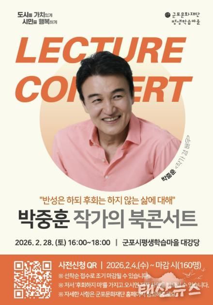 태산뉴스 이동욱 기자 | 군포문화재단 군포시평생학습마을은 2월 28일 렉처콘서트의 일환으로 북콘서트를 개최한다. 올해 3회를 맞이하는 렉처콘서트는 시민이 참여하여 즐길 수 있는 평생학습 대표 행사로서 자리매김하고 있다.