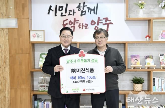 태산뉴스 이동욱 기자 | 양주시는 최근 ㈜미진식품로부터 이웃돕기 성품으로 백미 10kg 100포(400만 원 상당)를 기탁받았다고 밝혔다.