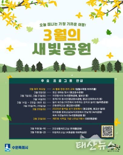 태산뉴스 이동욱 기자 | 수원특례시는 3월 한 달간 도시공원에서 다채로운 시민 참여형 봄맞이 프로그램을 운영한다. 생태·문화·체육 활동을 확대해 공원을 일상 속 체험과 여가의 공간으로 활용할 계획이다.
