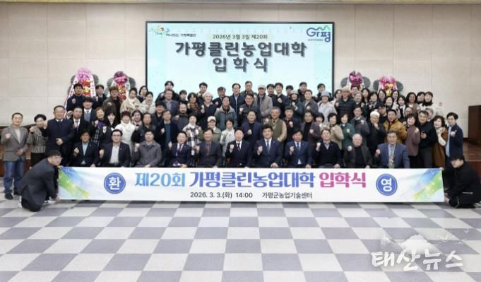 태산뉴스 이동욱 기자 | 가평클린농업대학이 3일 농업기술센터 3층 대강당에서 ‘2026년 제20회 가평클린농업대학 입학식’을 열고 76명의 신입생을 맞았다. 입학식에는 농식품학과, 스마트농업과, 농촌관광과 입학생과 내빈 및 관계자 등 90여명이 참석해 새로운 출발을 축하했다.