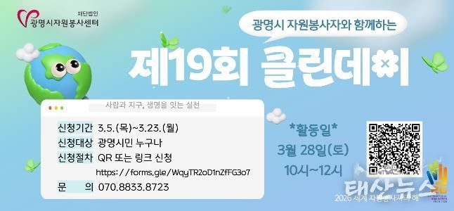 태산뉴스 이동욱 기자 | 광명시자원봉사센터는 오는 3월 28일 자원봉사 단체․활동처 및 광명 시민이 함께 광명시 전역에서 환경정화 활동을 펼치는‘제19회 광명시 자원봉사자와 함께하는 클린데이’를 진행한다고 밝혔다.