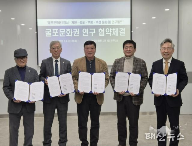 태산뉴스 이동욱 기자 | 부천문화원과 강서문화원, 계양문화원, 김포문화원, 부평문화원은 3월 4일 부천문화원에서 ‘굴포문화권’을 토대로 하는 연구교류 협약식을 체결했다. 이로써 ‘굴포’를 같은 문화권으로 하는 부천문화원·강서문화원·계양문화원·김포문화원·부평문화원은 학술대회와 콘텐츠 발굴 사업 등 다양한 지역학 자원을 발굴하고 활성화하기 위해 최초로 지역학 연구 모델을 구축하게 됐다. 특히, 이번 협약은 경기도(부천, 김포), 서울특별시(강서), 인천광역시(계양, 부평)를 잇는 ‘지역학’중심의 연구 교류를 마련한다는 점에서 주목된다.
