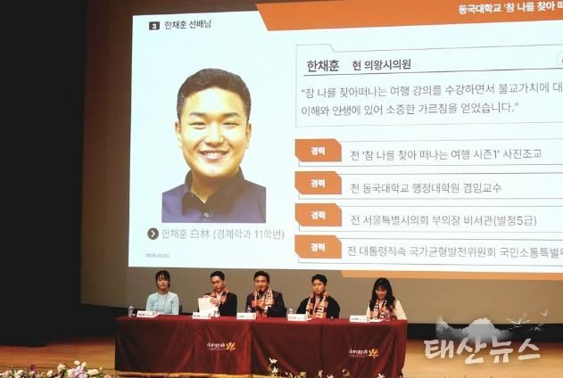 태산뉴스 김준수 기자 | 한채훈 의왕시의회 의원이 지난 3일 오후 모교인 동국대학교에서 열린 건학 120주년 기념 특별 강좌 ‘참 나를 찾아 떠나는 여행’의 첫 번째 멘토로 나서 420여 명의 후배들에게 도전과 희망의 메시지를 전했다.