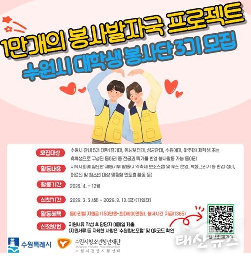 태산뉴스 이동욱 기자 | 수원시청소년청년재단 수원시청년지원센터는 3월 3일부터 3월 13일까지 지역사회 봉사 문화를 확산하고 대학생들의 사회공헌 활동을 지원하기 위한 '1만 개의 봉사발자국' 참여 동아리를 모집한다.