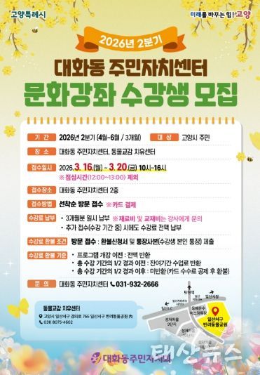 태산뉴스 이동욱 기자 | 고양특례시 일산서구 대화동 주민자치회는 주민들의 문화적 욕구를 충족하고 삶의 질을 높이기 위해 오는 3월 16일부터 20일까지 ‘2026년 2분기 문화강좌’ 수강생을 모집한다.