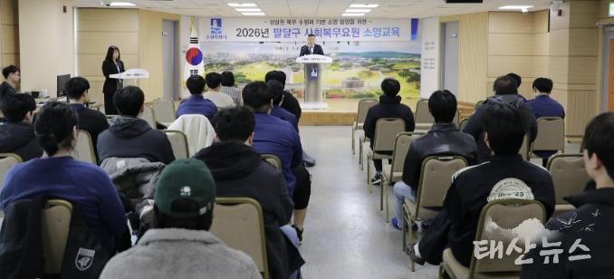 태산뉴스 이동욱 기자 | 수원시 팔달구는 지난 5일 팔달구청 대회의실에서 사회복무요원 전원을 대상으로 2026년 상반기 소양교육을 실시했다.