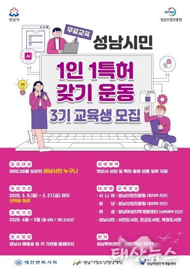 태산뉴스 이동욱 기자 | 성남산업진흥원은 시민의 창의적인 아이디어를 지식재산으로 보호하고 창업으로 연결하기 위해 '성남시민 1인 1특허 갖기 운동' 제3기 교육생을 모집한다고 밝혔다.