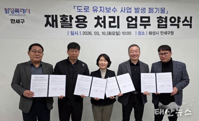 태산뉴스 이동욱 기자 | 화성특례시 만세구가 도로 유지보수 과정에서 발생하는 폐기물을 효율적으로 처리하고 자원 재활용을 확대하기 위해 관내 아스콘 생산 업체와 ‘폐아스콘 재활용 처리 협약’을 체결했다.