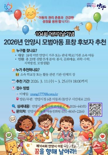 태산뉴스 이동욱 기자 | 안양시는 어린이날을 맞아 다양한 분야에서 모범이 되는 아동을 발굴하기 위해 ‘2026년 모범아동 유공 표창’ 후보자를 11일부터 25일까지 추천받는다고 11일 밝혔다.