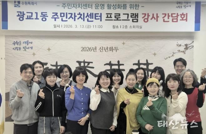 태산뉴스 이동욱 기자 | 수원특례시 영통구 광교1동은 지난 13일 광교1동 주민자치센터 활성화와 운영 개선 방안을 모색하기 위해 주민자치센터 프로그램 강사 간담회를 개최했다.