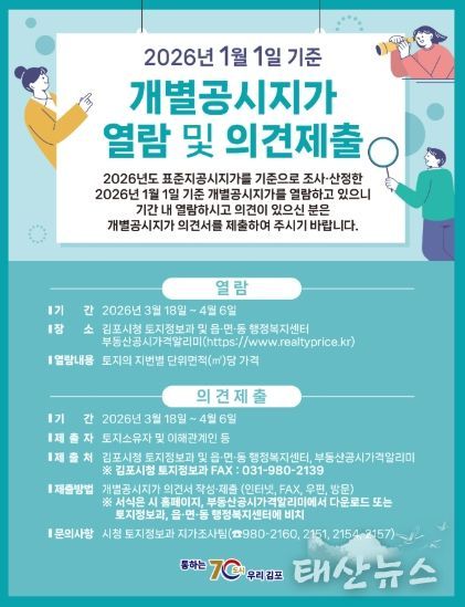태산뉴스 이동욱 기자 | 김포시는 2026년 1월 1일 기준 개별공시지가(안)에 대하여 오는 3월 18일부터 4월 6일까지 열람을 실시하고 토지소유자 및 이해관계인의 의견을 접수한다고 밝혔다.
