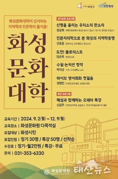태산뉴스 이동욱 기자 | 화성문화원이 오는 30일까지 화성문화대학 2학기 교육생을 선착순 모집한다.